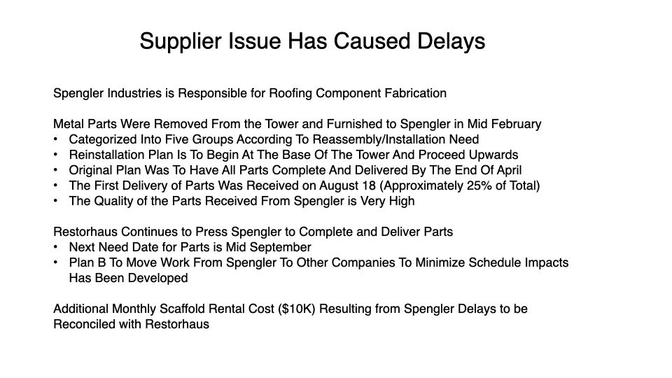 While there have been small repairs and some repainting done over the past century, some significant work needs to be done now on the sheet metal exterior, the plywood underneath, the window frames, the domed roof and the weather vane. A new weatherproof membrane will be installed to protect the interior of the bell tower, and the new sheet of tin coated stainless steel siding will be painted to the original three colors (looking very similar in color to the courthouse). For a number of months, scaffolding will surround the bell tower, but we are hopeful that a path will be created so as to not block the doors or the ramp into the north entryway. Using the specialty materials mentioned above along with proven historic building restoration techniques, it is expected that the bell tower will last for another 130 years.